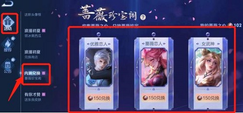 2 、珍宝找到内测兑换即可兑换。荣耀集齐150个蔷薇之心就可以兑换限定的珍宝皮肤了。珍宝阁是荣耀重大活动才会开启一次的,